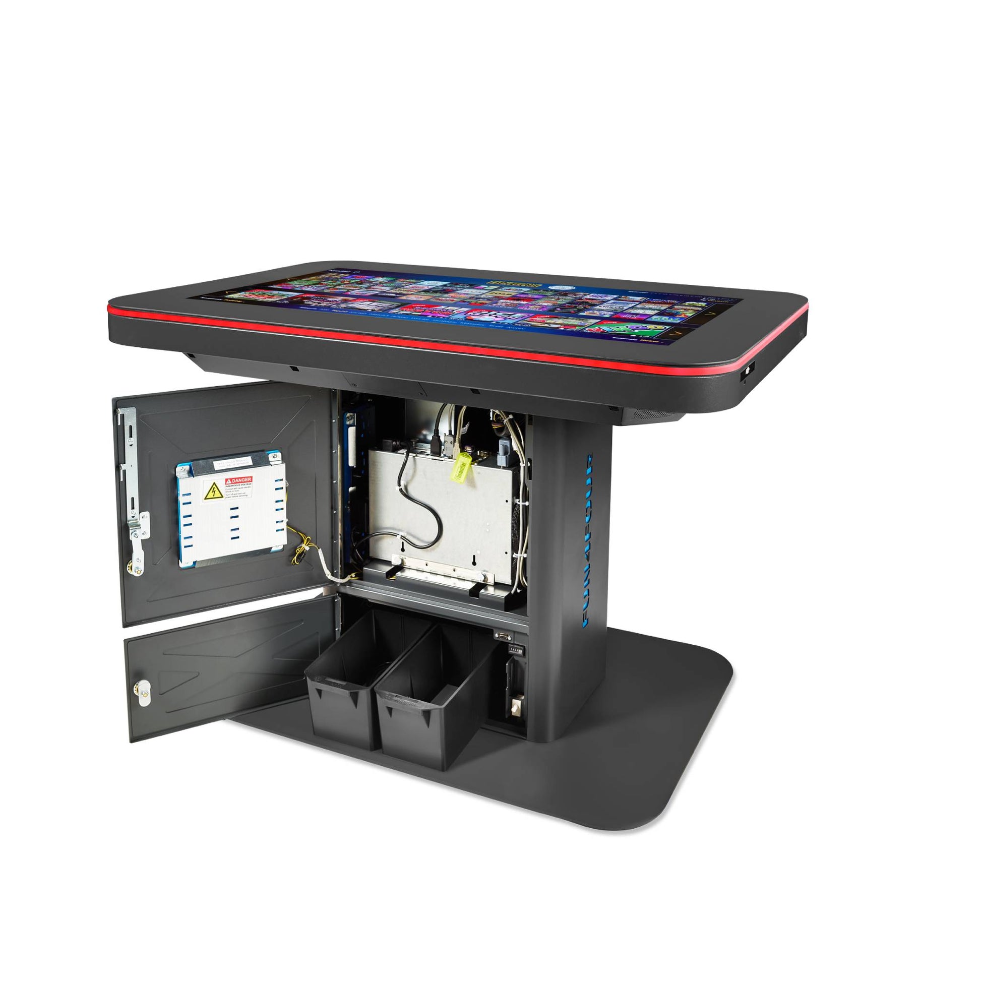游戏桌稳定的钢结构和高强度表面玻璃确保您和您的客人的安全。尽管如此,Fun4Four-Sales在硬件和软件上都提供了保证。游戏桌上没有划痕或锋利的边缘可能会伤害您的顾客。游戏桌还100%防水,不用担心被淋湿!